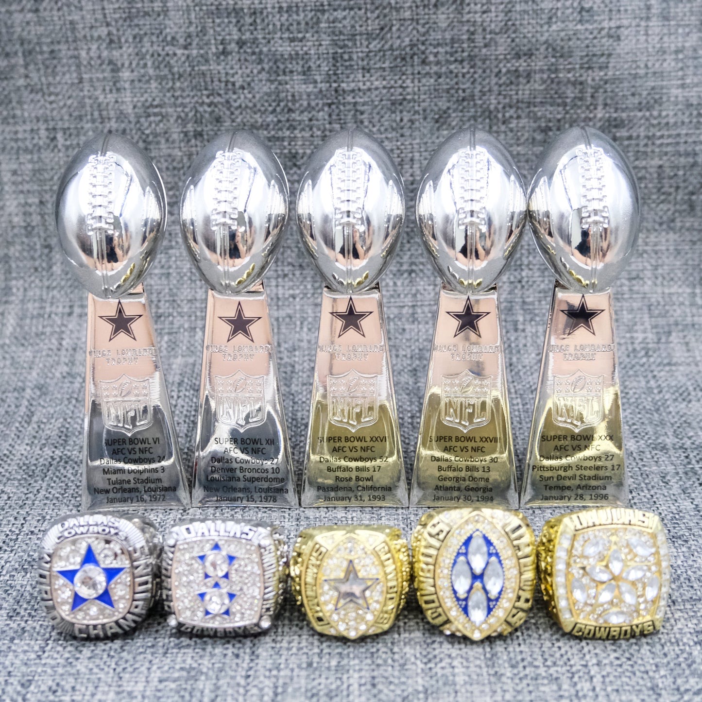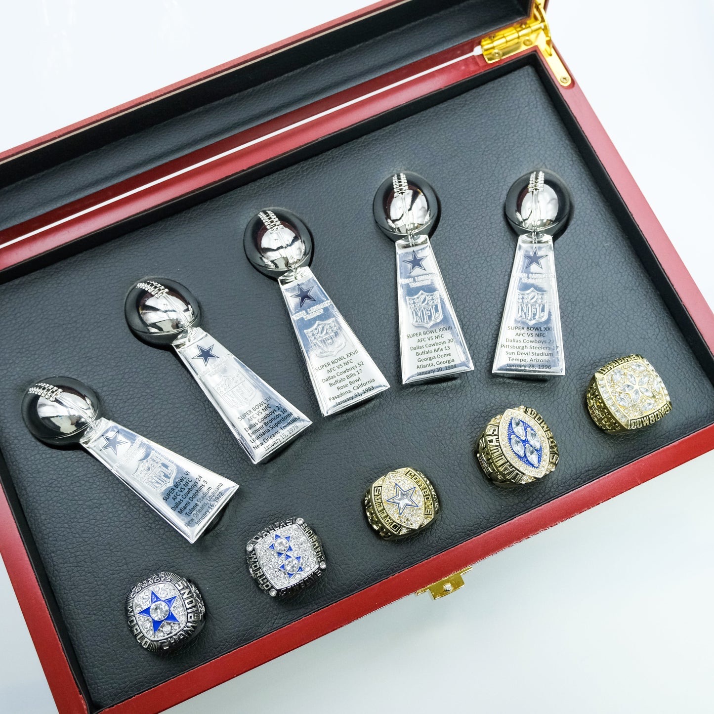 [Dallas Cowboys ]5 Trophys and 5 Pcs Ring Set + Box NFL